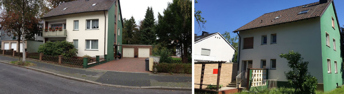 Ausgangssituation: kleines Mehrfamilienhaus aus den 60er Jahren in zeittypischer Gestaltung. Grüne Giebel, Jägerzaun im Vorgarten, kleine und dunkle Räume