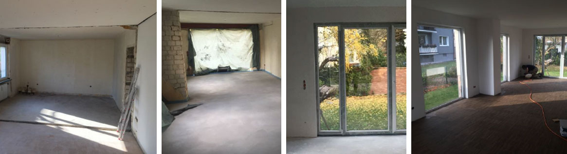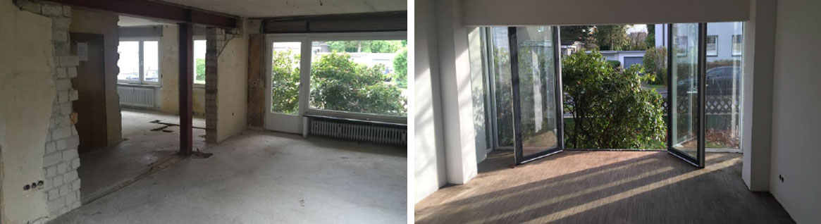 Gewerke: Trockenbau | Innenausbau | Abbrucharbeiten | Fensterbau. Die Wand zwischen dem ehemaligen Schlafzimmer und dem Wohnzimmer wurde entfernt und eine Fensteranlage mit ,Zugang zum Garten geschaffen.