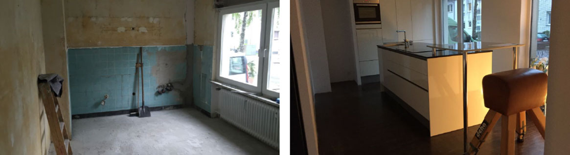 Gewerke: Trockenbau | Innenausbau | Abbrucharbeiten | Fensterbau. In der Küche wurden Fenster ebenfalls bodentief ausgeführt. Eines der Fenster als zweiflügelige Tür. Damit erhalten die Bewohner einen Zugang aus der Küche auf eine kleine Terrasse.