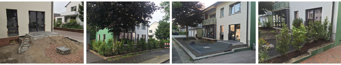 Gestaltung des Vorgartens mit kleiner Terrasse vor der Küche und Regenwasserverrieselung.