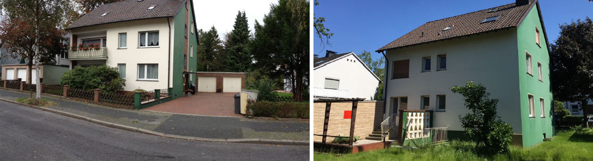Ausgangssituation: kleines Mehrfamilienhaus aus den 60er Jahren in zeittypischer Gestaltung. Grüne Giebel, Jägerzaun im Vorgarten, kleine und dunkle Räume